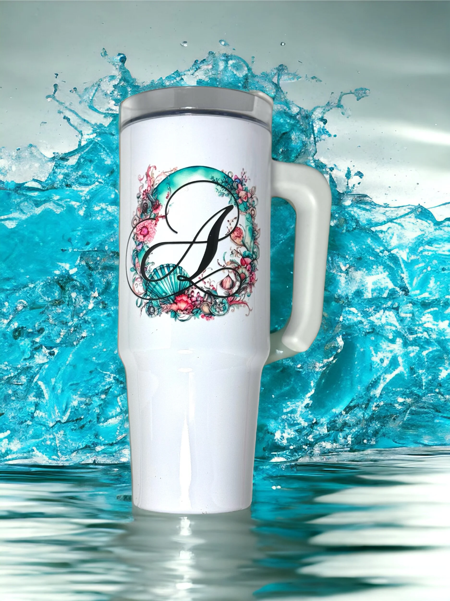 Color Palette: The tumbler is pristine white, while the vibrant turquoise monogram is accentuated with a delightful floral and seashell design, all elegantly presented in a script font.