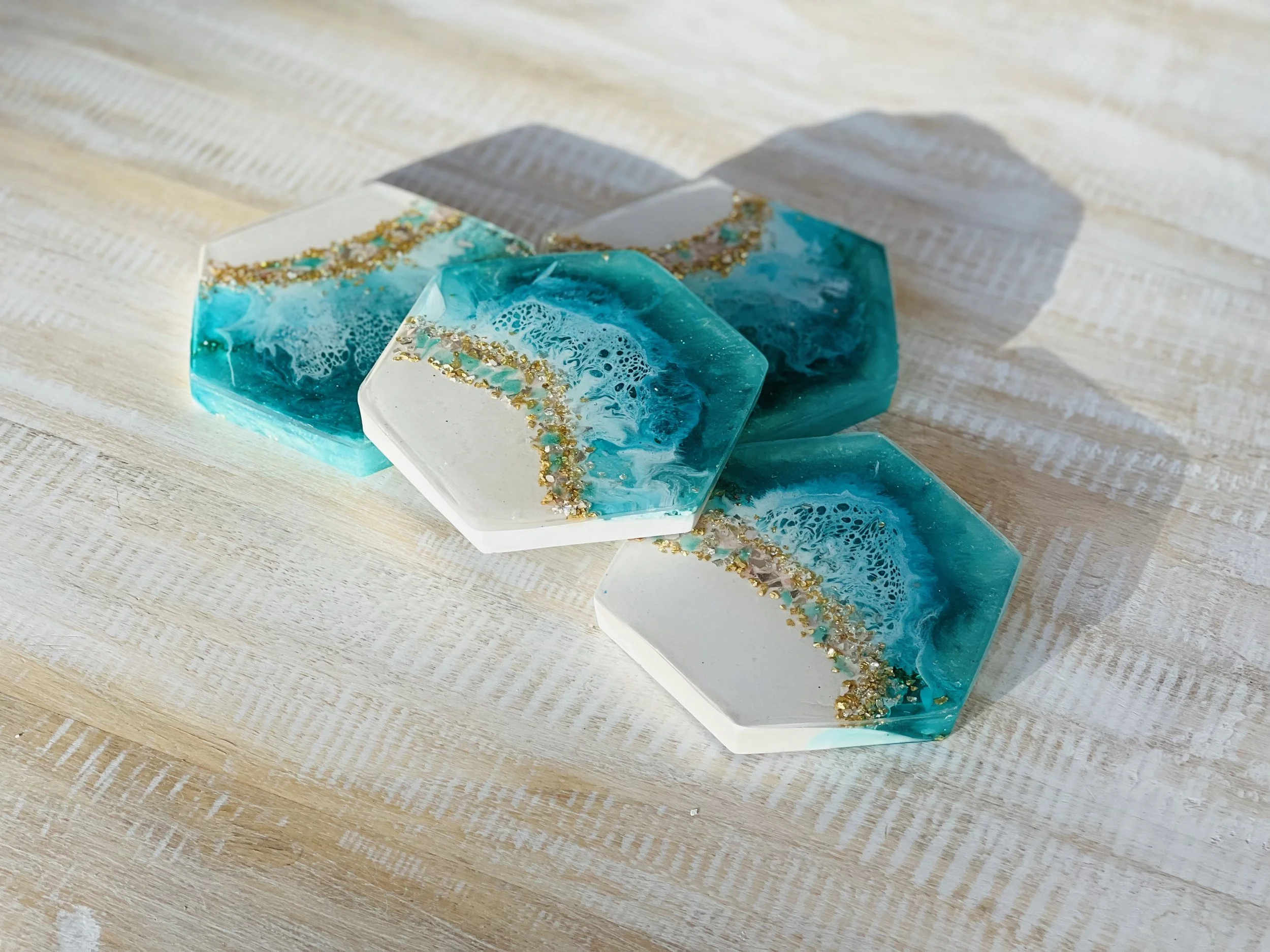 Hand-painted white base with glittered resin “beach wave” finish